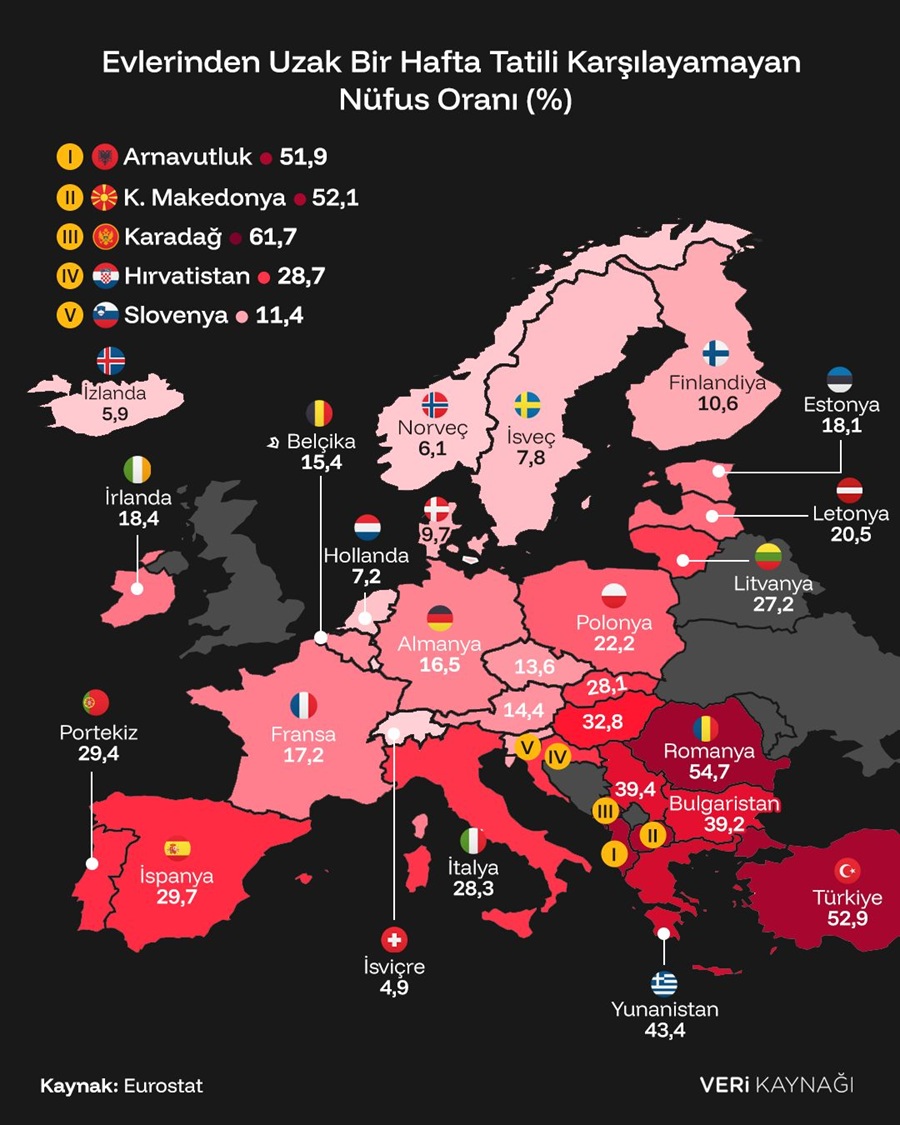 Tatil yapamama oranlarının en yüksek olduğu ülkeler arasında Karadağ (%61,7), Türkiye (%52,9) ve Balkanlar’daki diğer ülkeler dikkat çekiyor. Her iki ülkede de her iki kişiden biri, yalnızca yedi günlük bir tatili dahi ekonomik sebeplerle gerçekleştiremiyor. Bu durum, sosyal eşitsizlik, düşük gelir seviyesi ve hayat pahalılığı gibi yapısal sorunların, bireylerin yaşam kalitesi üzerindeki etkisini bir kez daha ortaya koyuyor.