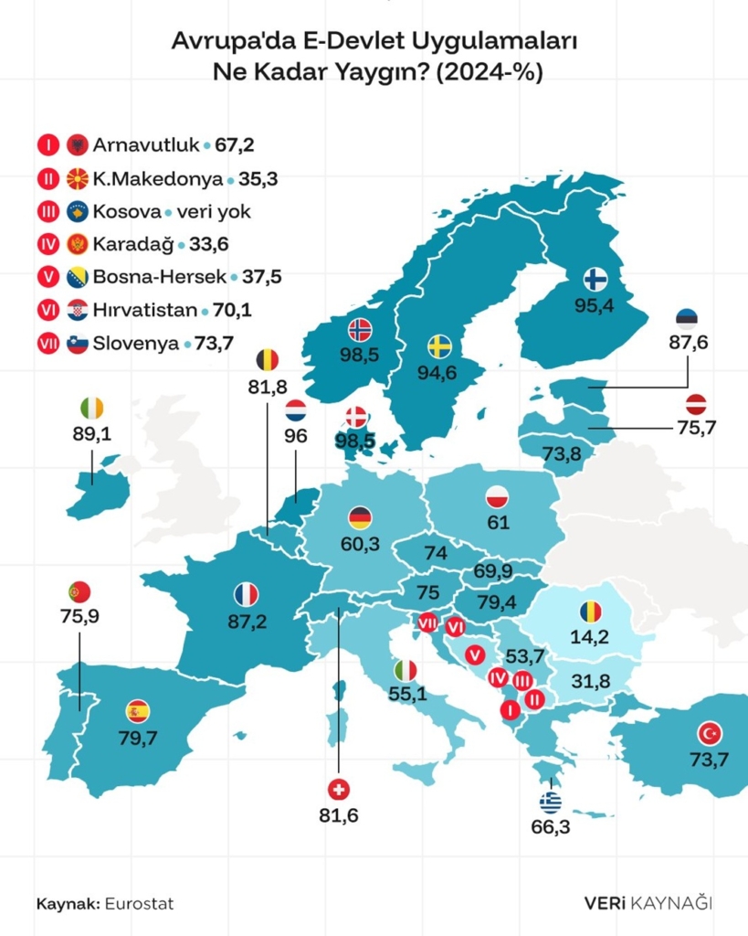 En yüksek e-devlet yaygınlık oranlarına sahip ilk üç ülke sırasıyla Estonya (%98,5), Danimarka (%98,5) ve Hollanda (%96) olarak dikkat çekiyor. Bu ülkeler, e-devletin her alanda etkin bir şekilde kullanılmasıyla örnek oluşturuyor. Diğer yandan, Kosova için herhangi bir veri bulunmazken, en düşük oranların görüldüğü ülkeler arasında ise Moldova (%14,2), Karadağ (%33,6) ve Kuzey Makedonya (%35,3) yer alıyor. Bu ülkeler, dijital kamu hizmetlerine yönelik altyapılarını geliştirme konusunda hala önemli bir yol kat etmesi gerektiğini gösteriyor.