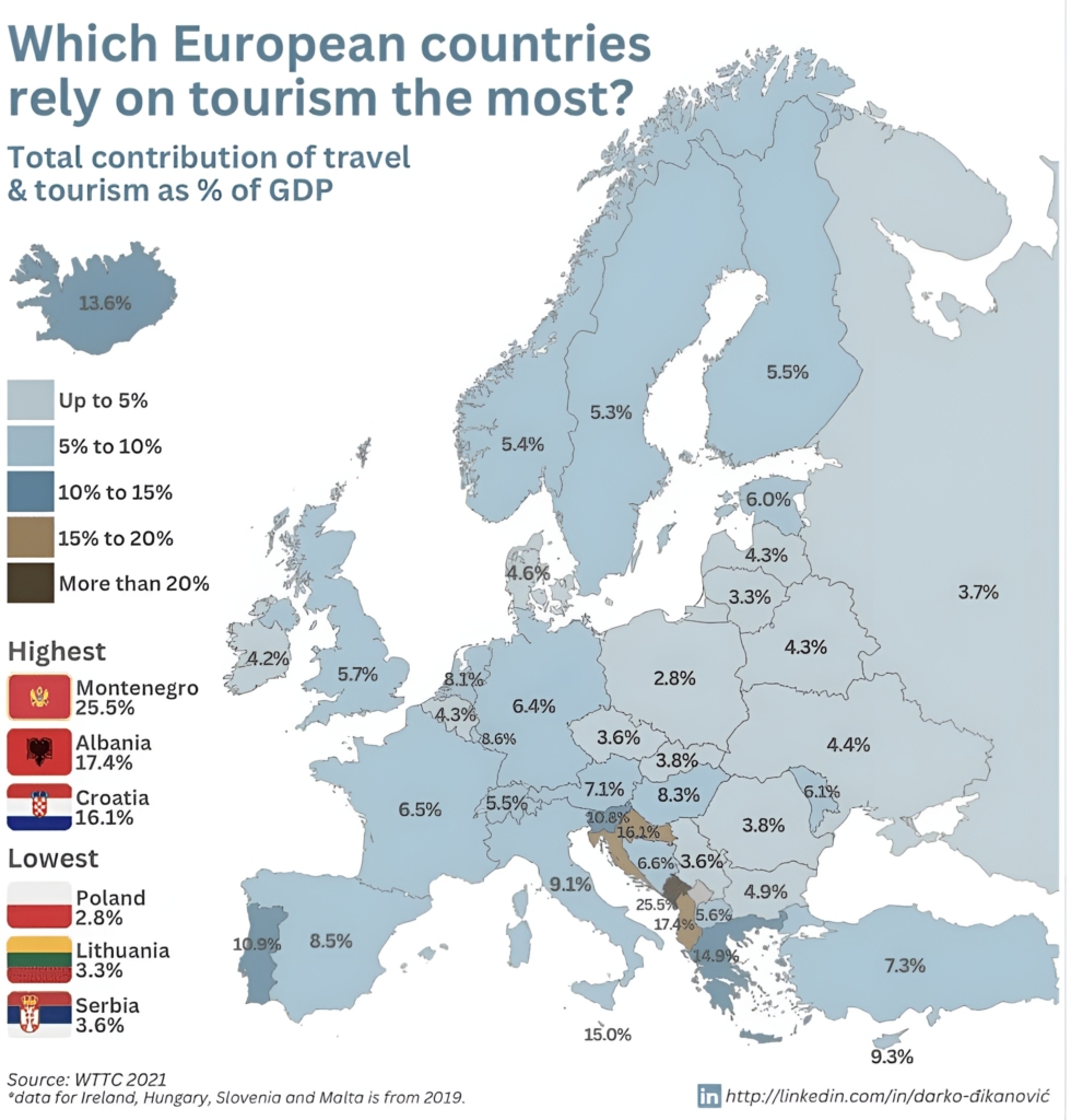 Avrupa’nın geri kalan bölgelerinde turizmin GSYİH’ye katkısı %5 ila %15 arasında değişiklik gösteriyor. Fransa, İtalya, İspanya gibi ülkeler turizme önemli ölçüde bağımlı olsalar da, Montenegro kadar büyük bir orana sahip değiller.