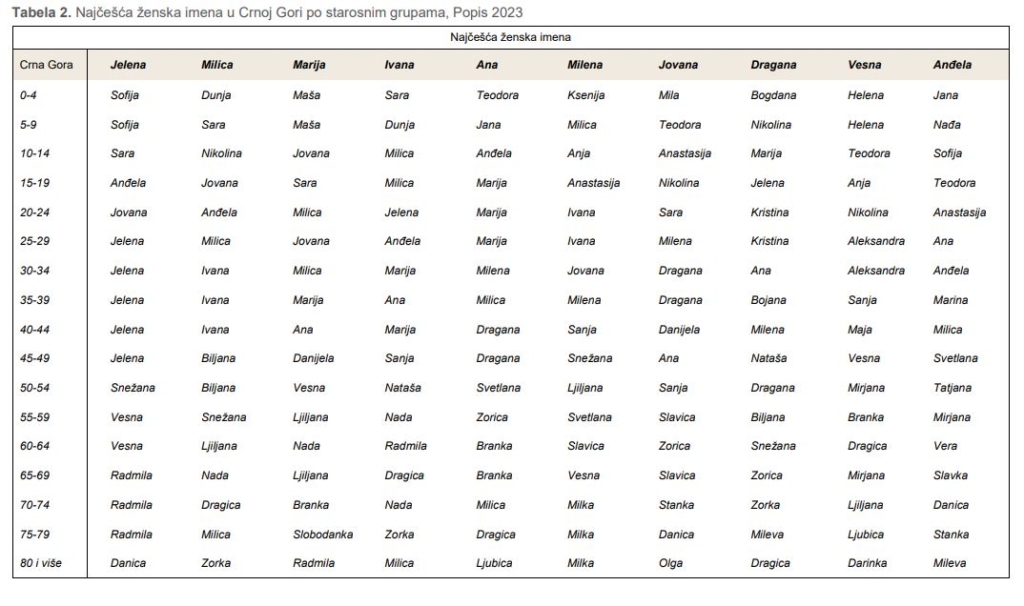 Bu tabloda, çeşitli yaş gruplarına göre en sık kullanılan kadın isimleri yer alıyor. Örneğin, 0-4 yaş grubunda en yaygın isimler arasında “Sofija” ve “Dunja” bulunurken, 80 yaş ve üzeri grupta “Danica” ve “Zorka” gibi isimler öne çıkıyor.