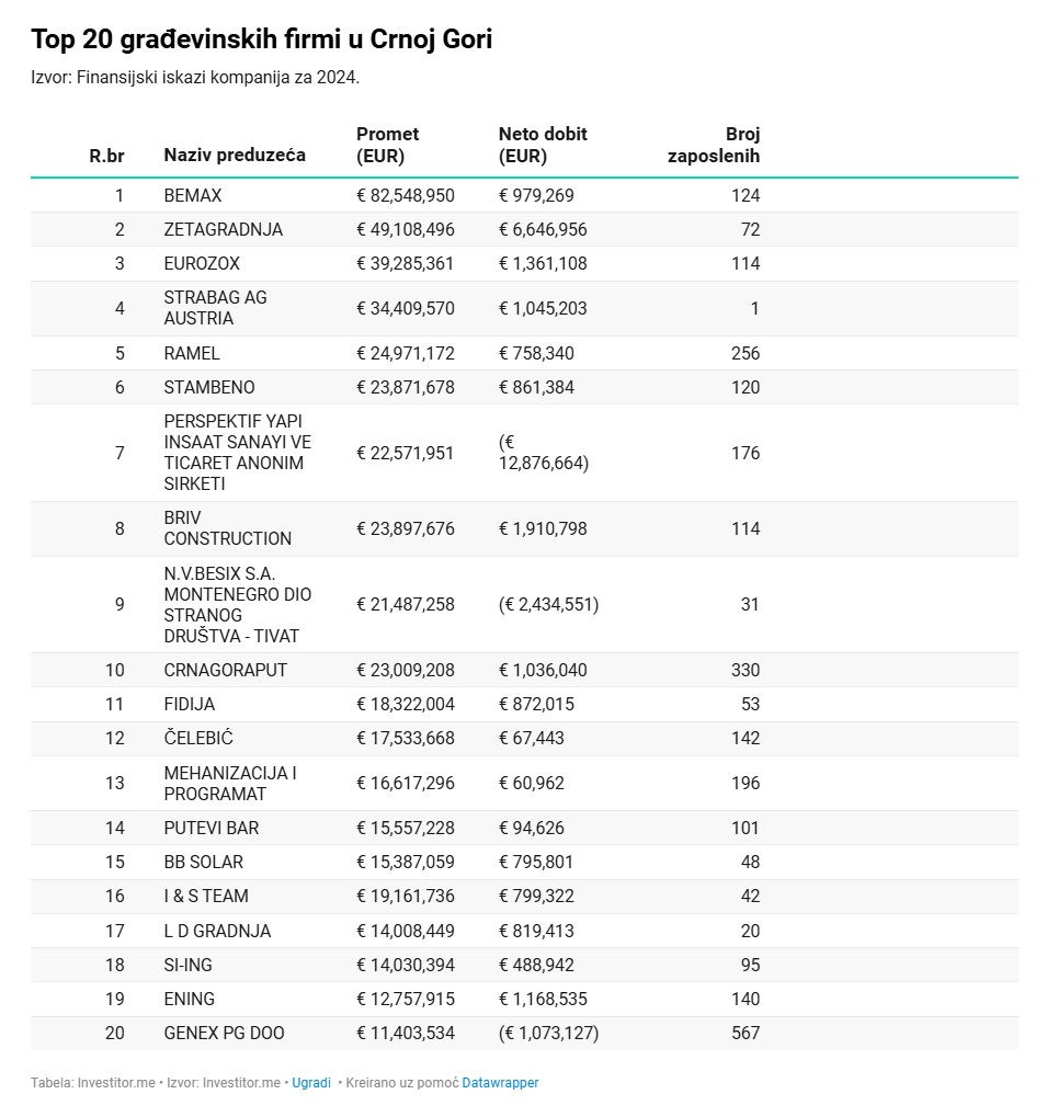 2024 yılında, ülkedeki en büyük 20 inşaat şirketi toplamda yaklaşık 500 milyon avro ciro elde ederek, Karadağ’daki güçlü yatırım ve yapılaşma döngüsünü gözler önüne serdi.