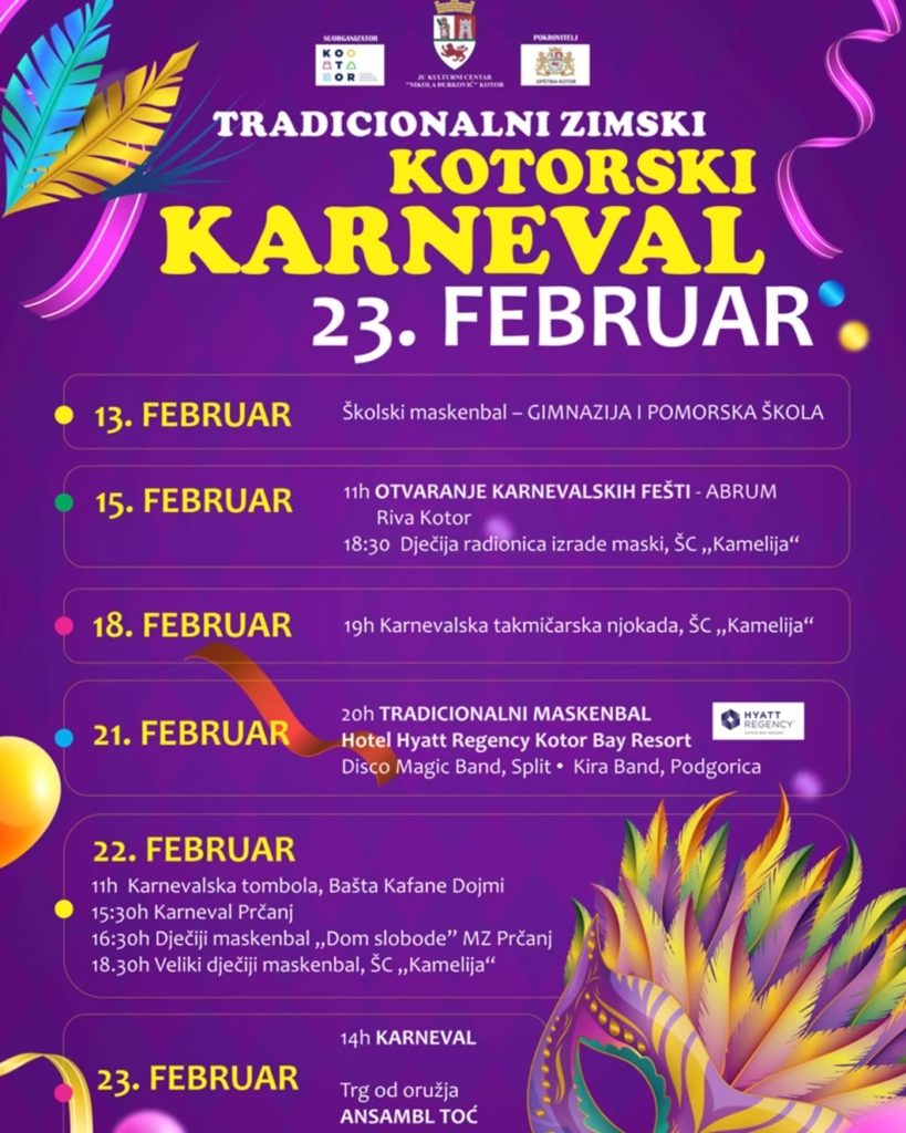 Kotor, 13-23 Şubat tarihleri arasında renkli etkinliklerle dolu Kış Karnavalı’na ev sahipliği yapacak. Kotor Belediyesi himayesinde düzenlenen şenliklerin organizasyonu, Kotor Kamu Kurumu Kültür Merkezi “Nikola Đurković” tarafından yürütülüyor. Kotor Turizm Örgütü ve Karampana Sivil Toplum Örgütü’nün de destek verdiği etkinlikler, şehri tam anlamıyla bir karnaval atmosferine bürüyecek.