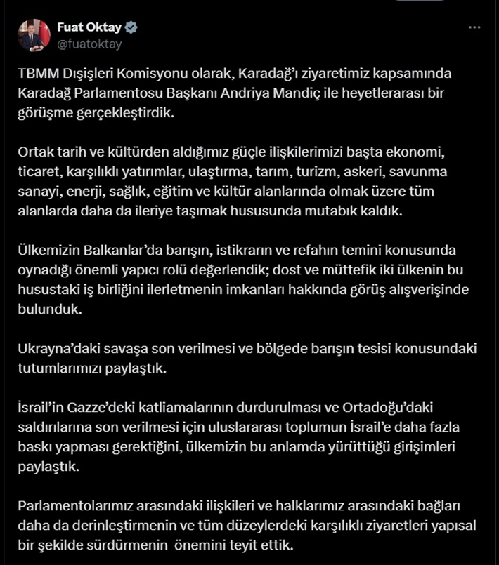 Türkiye Büyük Millet Meclisi Dışişleri Komisyonu Başkanı Fuat Oktay ile Karadağ Meclis Başkanı Andrija Mandić arasındaki görüşmede, özellikle yenilenebilir enerji kaynaklarına dair işbirliği konuları ele alındı.